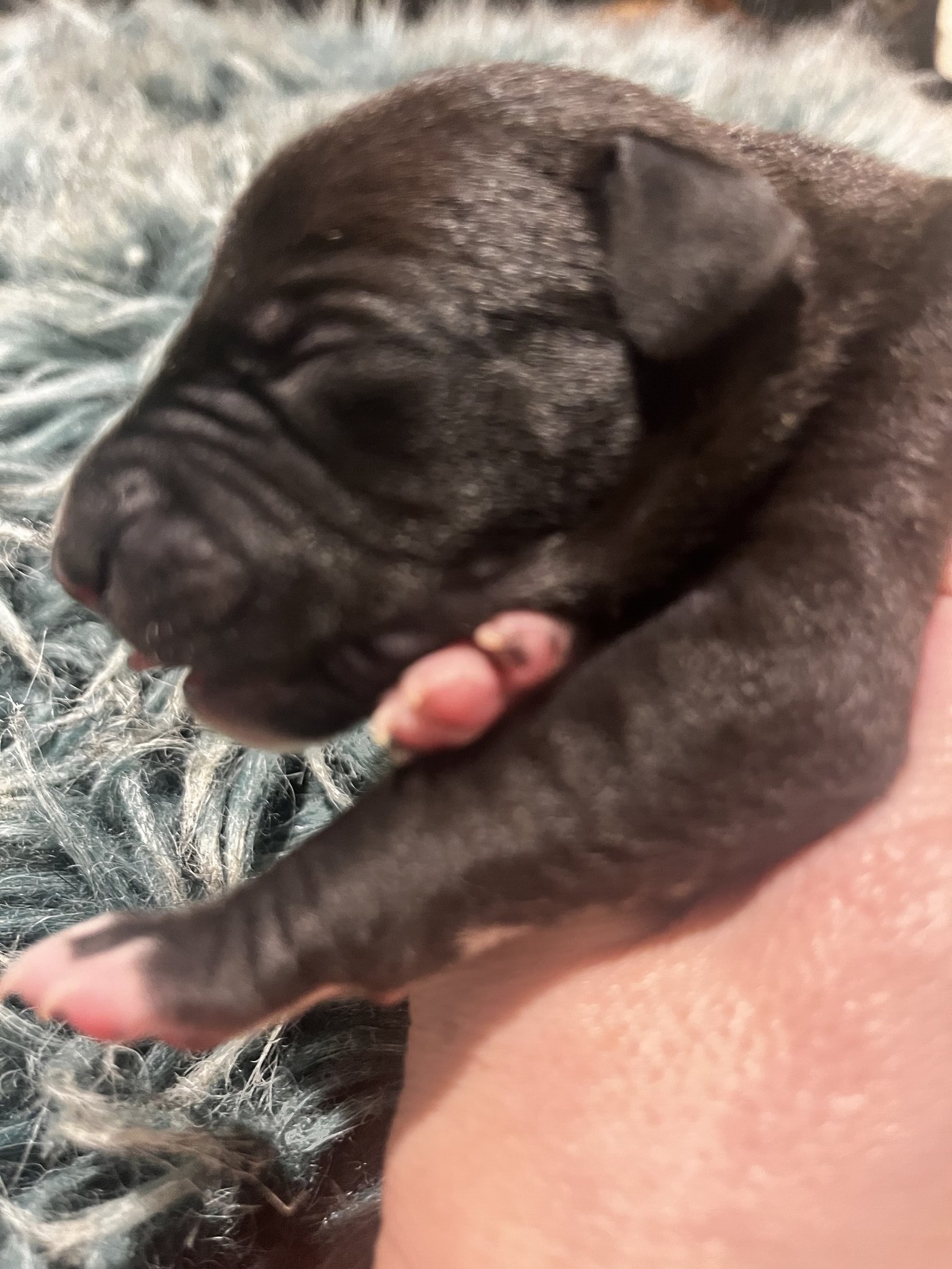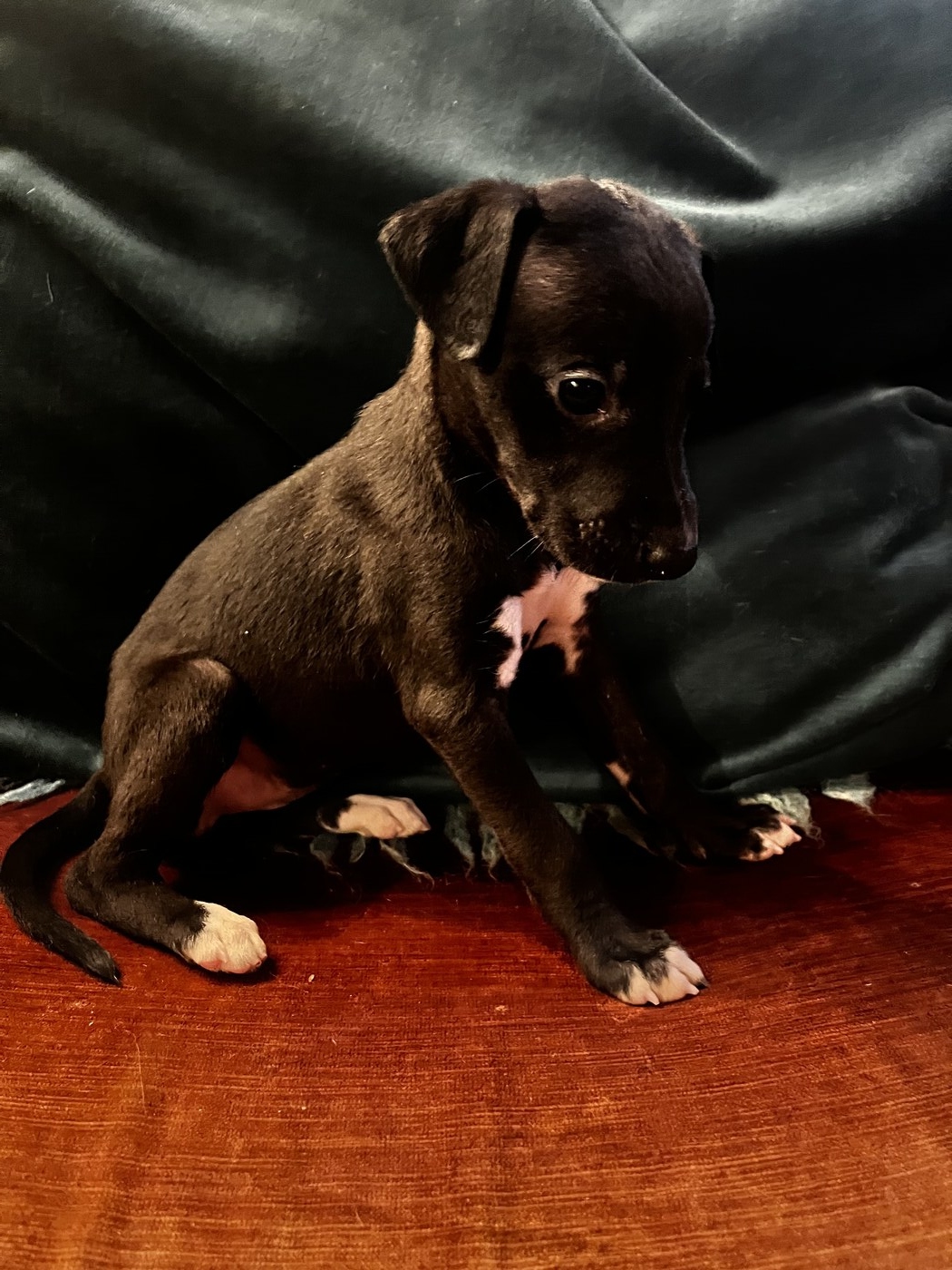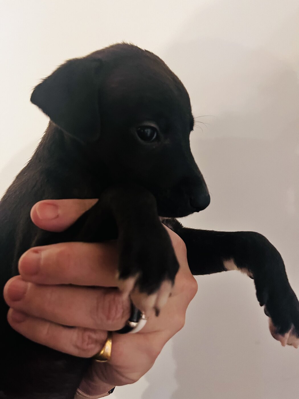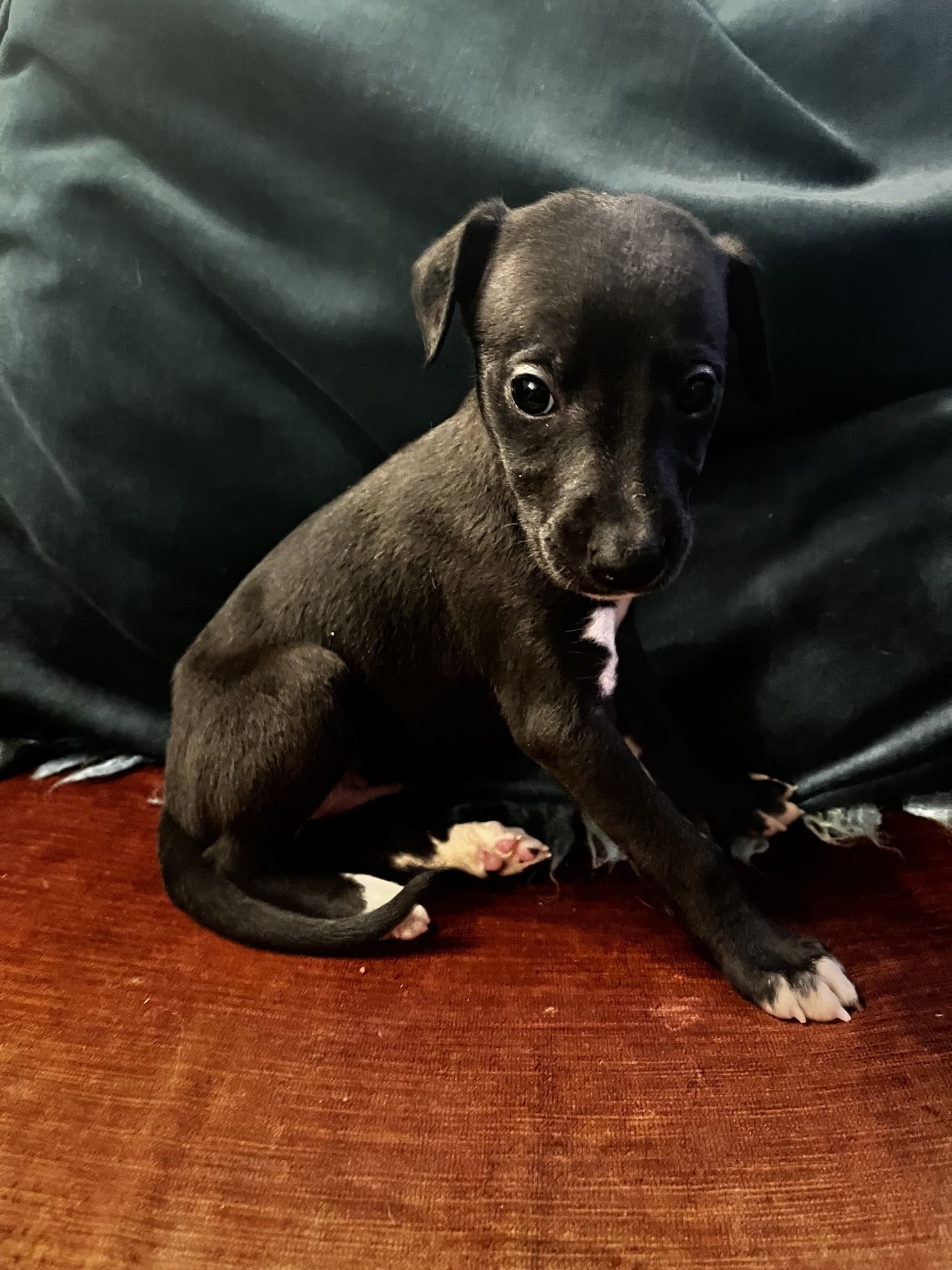 Merrybell was the first pup to be born in our Whippet 'M' Litter to Radish and Rupert and the first of the girls pups - She is black with white trim and has little white tips to feet and a white chest. She can be distinguished from her sister as she has a completely black face.