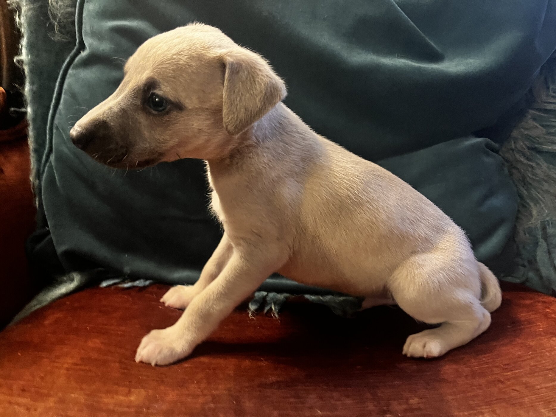Mistletoe was the second pup to be born in our Whippet 'M' Litter to Radish and Rupert and the first of the boys - He is Blue Fawn in Colour and has a blue mask with white markings.