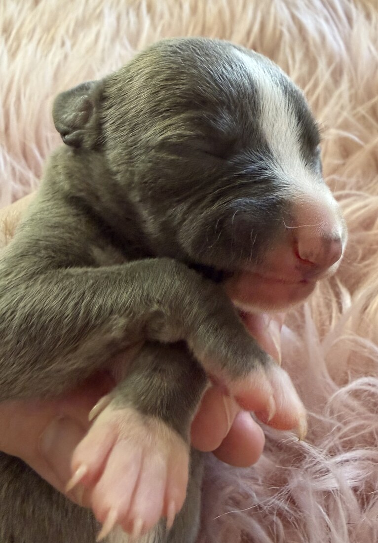 - Colour: Blue Brindle White Trim